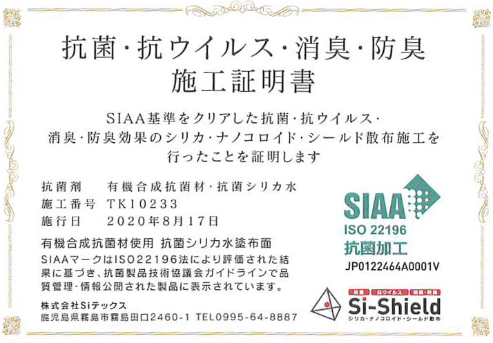 当店では抗菌・抗ウイルス・消臭・防臭機能のある“2000以上の菌に対し効果を発揮する「Si 抗菌シリカ水」”を使用。